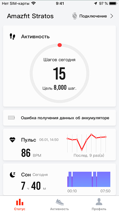 Главный экран. Активность, заряд батареи, пульс, сон.