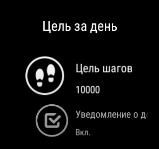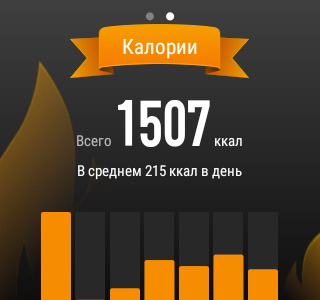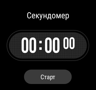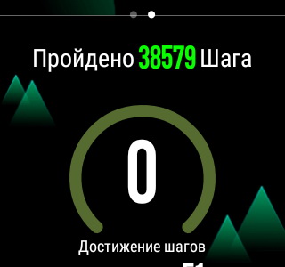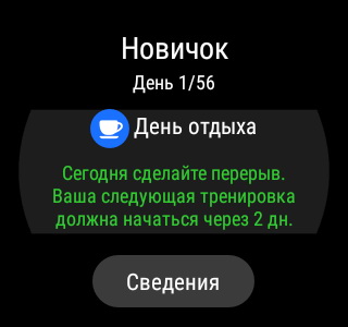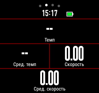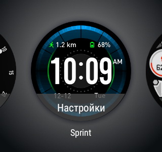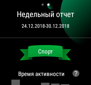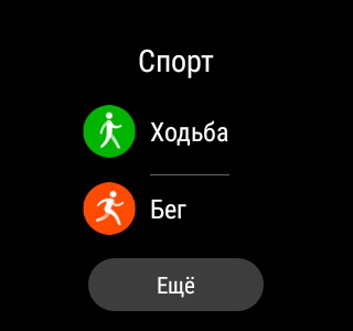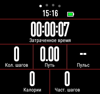 Второй экран - спорт. Здесь запускается текущая тренировка. Этот же экран вызывается по центральной кнопке (для скорости).