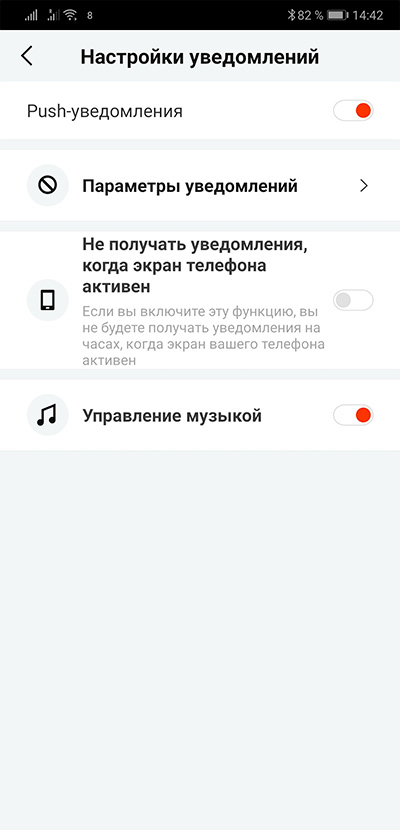 Однако с часов спокойно можно управлять воспроизведением на смартфоне: для этого достаточно в профиле в настройках уведомлений включить управление музыкой на смартфоне.