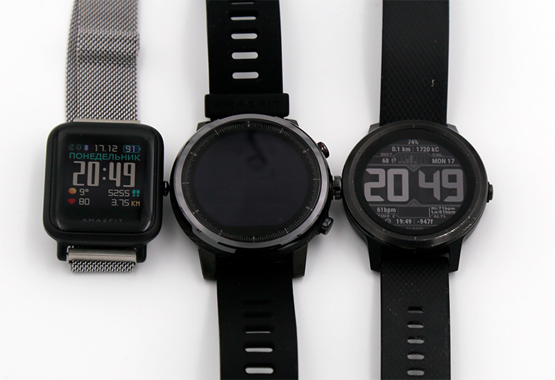 Вот эти часы в хорошей компании: слева - Amazfit Bip, справа - Garmin Vivoactive, которые выглядят значительно попроще.