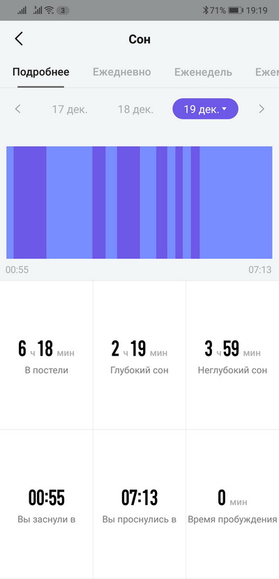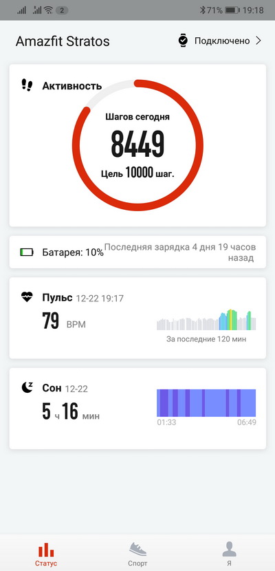 Также должен заметить, что у Amazfit намного лучше работает отслеживание сна, чем у всех остальных "умных" часов, что у меня были. Garmin, Samsung, LG, Huawei - нередко промахивались с определением начала сна, могли оборвать отслеживание при кратковременном просыпании. У Garmin еще и данные в приложение по сну поступают чуть ли не в середине дня: никогда нельзя было сразу посмотреть данные. У Amazfit - все четко: и определяет практически без ошибок, и сразу все доступно.