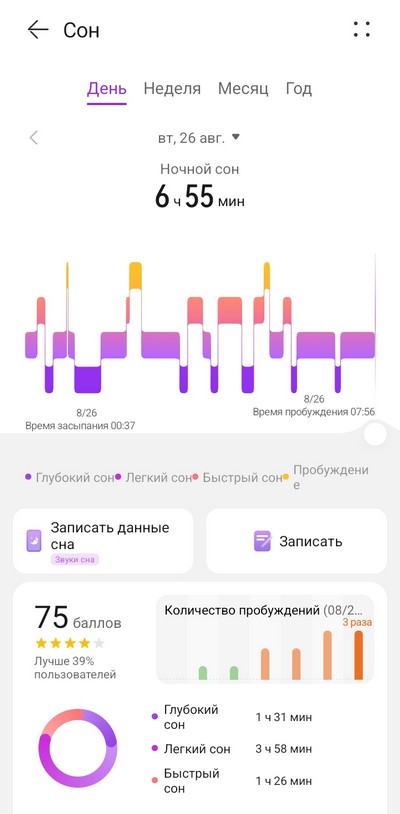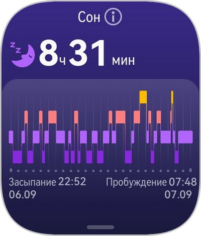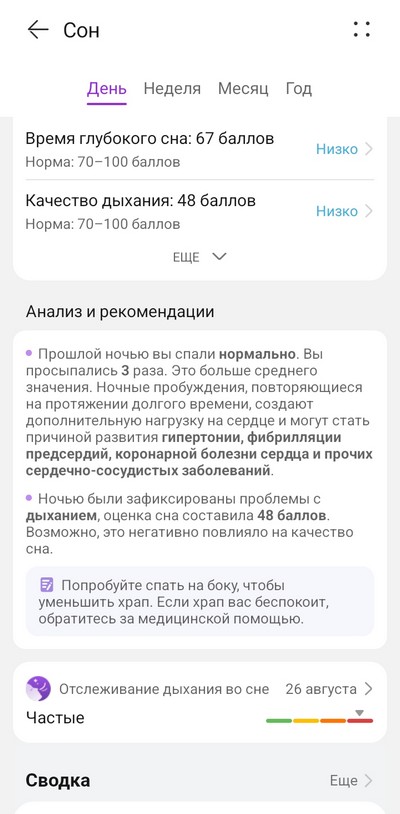 Сон отслеживается очень подробно, часы умеют измерять храп (с помощью смартфона, который должен лежать недалеко), и по поводу сна дают подробный отчет с рекомендациями (пример будет ниже на скриншотах со смартфона). По качеству отслеживания сна эти часы превосходят часы Samsung, у которых известная проблема - они часто не ловят ситуацию, когда я просыпаюсь на какое-то время, а потом снова засыпаю. У данных часов этой проблемы нет, все отслеживают четко. Также отслеживают дневной сон и его записывают отдельно.