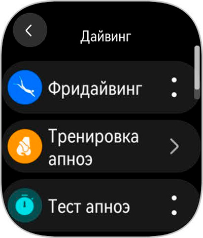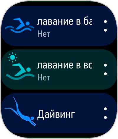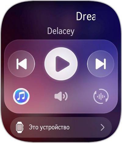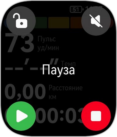 Из тренировки можно переходить к другим приложениям - по двойному нажатию верхней кнопки. В приложении тренировки доступно окно с паузой, возобновлением тренировки и окончанием тренировки. Также доступен плеер, в котором можно выбирать, что именно воспроизводить: аудиотреки с самих часов или управлять плеером на смартфоне.