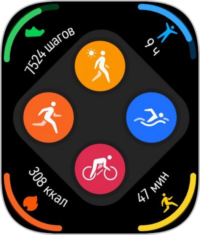 Мониторинг: сон, физическая активность, тренировки (100 видов), сердечный ритм, оксигенация крови, температура руки, ЭКГ