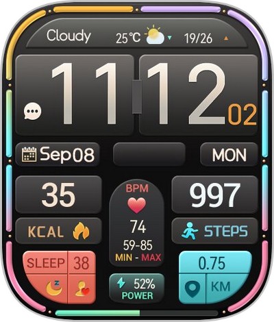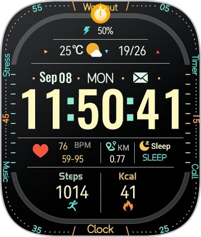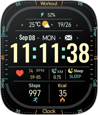 Здесь есть полноценный режим AOD (однако расписание для него задавать нельзя, он включается и выключается соответствующей пиктограммой), и каждый циферблат имеет свой "спящий" режим. Ярких спящих режимов, как у часов Samsung Galaxy Watch7 или OnePlus Watch 3 я тут не обнаружил (но понятно, что я перебрал всего с десяток циферблатов, а их там сотни), AOD выглядит достаточно скромно, но время показывает, дату показывает, также есть AOD, которые выводят и другую информацию.