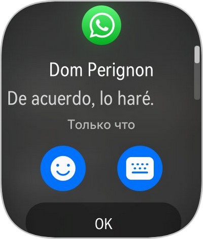 При нажатии на конкретное уведомление оно разворачивается целиком. На него можно ответить смайликом, предустановленным ответом (они редактируются в смартфоне), текстом с экранной клавиатуры.