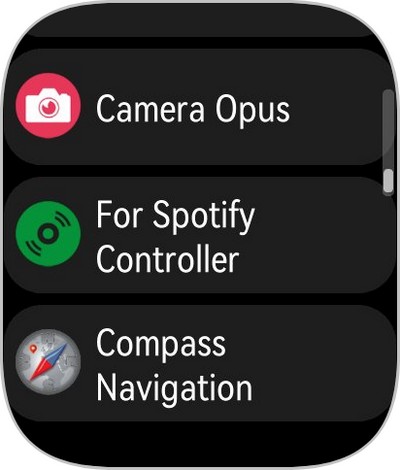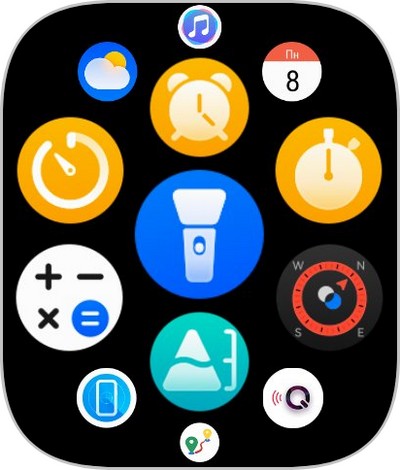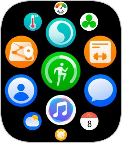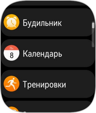 От циферблата нажатие верхней кнопки - список установленных приложений. Он может выводиться сеткой с пиктограмами.