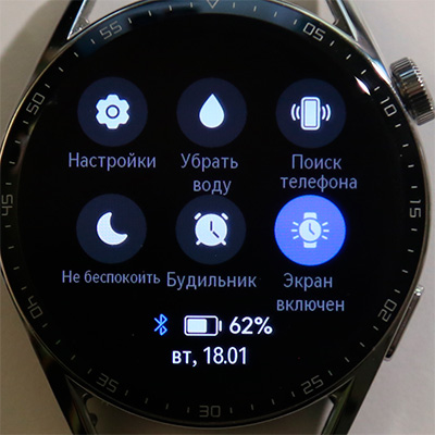 Свайп основного циферблата вниз - область быстрых переключателей и информации. Тут показываются уровень заряда батареи, статус подключения к телефону, дата и день недели. Также тут шесть пиктограмм: "Не беспокоить", режим постоянно включенного экрана, поиск смартфона, будильник, настройки, и "убрать воду" - обработка часов после погружения.