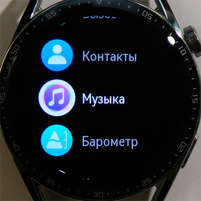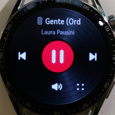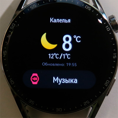 Виджет аудиоплеера. Часы умеют управлять проигрыванием на смартфоне, также умеют проигрывать музыку из памяти часов (аудиотреки туда закачиваются через приложение Huawei Health). Также в новом обновлении (2.1.0.221) появится возможность регулировать громкость воспроизведения с телефона прямо на часах поворотом верхней кнопки.