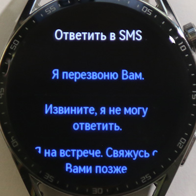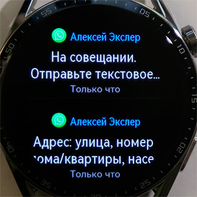 От циферблата свайп вверх - список уведомлений. При щелчке по уведомлению оно открывается, и его можно прочитать полностью. Также здесь появилась возможность отправлять эмодзи и предустановленные сообщения в ответ на сообщения в мессенджерах (раньше этого не было).