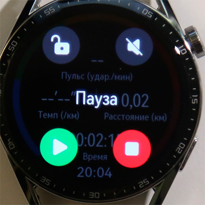 В режиме тренировки можно свайпить экраны с различными данными. Режим не многозадачный, то есть нельзя во время тренировки перейти на циферблат и вызвать любое приложение, при этом свайп вправо - вызов цифрового компаса, свайп влево - вызов аудиоплеера. Нажатие на верхнюю кнопку - режим паузы, где можно также закончить тренировку, включить/выключить голосовые оповещения о прохождении тренировки.
