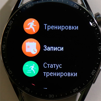 Нижняя кнопка (по ней можно настроить вызов любого приложения) - тренировки. Здесь более 100 режимов тренировок (их набор настраивается). У каждой тренировки есть настройки цели, напоминаний и маршруты, которые можно закачать из приложения. При старте тренировки часы будут ждать определения положения по GPS (если это требуется).