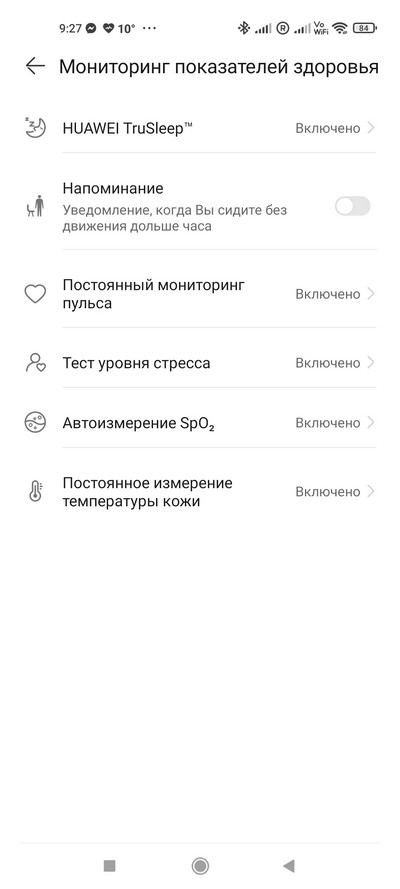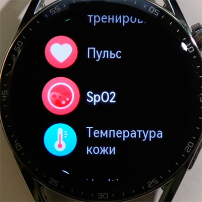 Настройки часов, настройка мониторинга. К старым видам мониторинга у GT2 добавились: автоизмерение SpO2 и постоянное измерение температуры кожи.