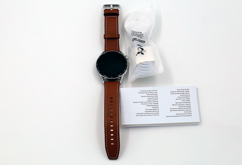 Комплект поставки - предельно простой: сами часы с ремешком, беспроводная зарядка с кабелем, инструкция на различных языках, включая русский. Кстати, у GT 2 в комплекте шел дополнительный черный силиконовый ремешок (полезная штука, учитывая тот факт, что кожаный ремешок довольно быстро теряет товарный вид), а здесь дополнительный ремешок положить пожлобились, и это при том, что цена часов выросла.