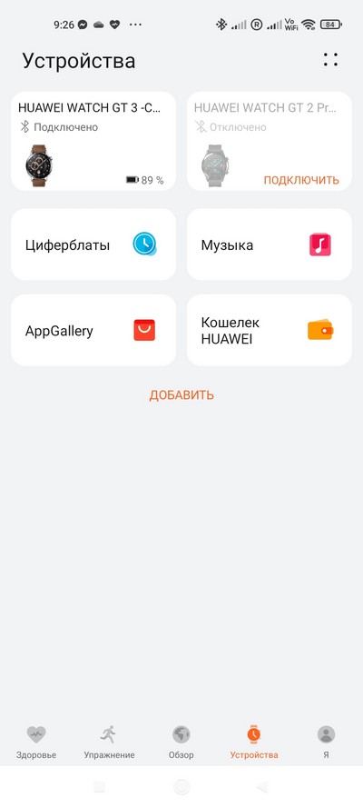 Подключенные к приложению часы и избранное. Страница часов. Обратите внимание на то, что среди избранных приложений есть "Кошелек HUAWEI". Сервис Huawei Pay в настоящий момент доступен в Китае, России, Гонконге, Пакистане, Сингапуре, Макао и Таиланде.