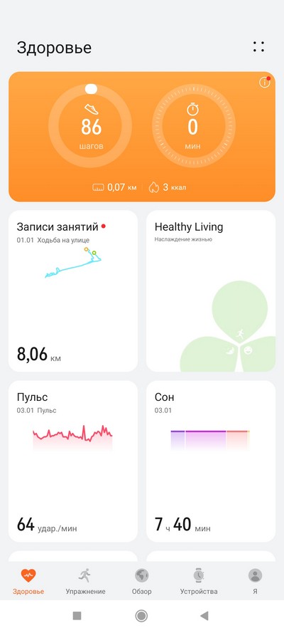 Основной раздел приложения с информационными панелями, история тренировок. Healthy Living - установка и отслеживание различных целей, касающихся здоровья.