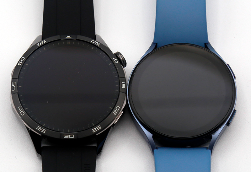 Ну и вот эта модель рядом с моими Samsung Galaxy Watch5. Samsung менее громоздкие, но дизайн у них совсем скучный, GT 4 смотрятся повеселее.