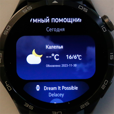 От циферблата свайп вправо - так называмый "Умный помощник". Что в нем такого умного - непонятно совершенно: это просто виджет погоды и виджет воспроизведения аудио.