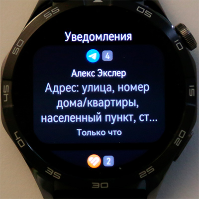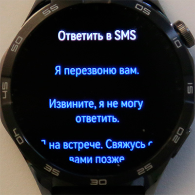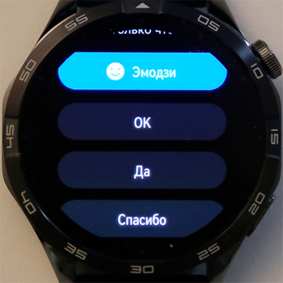 От циферблата свайп вверх - уведомления. Каждое уведомление можно раскрыть на весь экран и прочитать целиком. На уведомления можно отвечать смайликами или предустановленными сообщениями (они редактируется).
