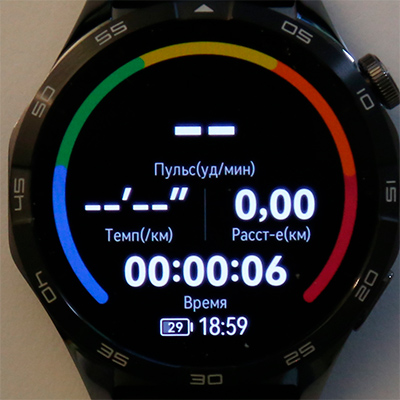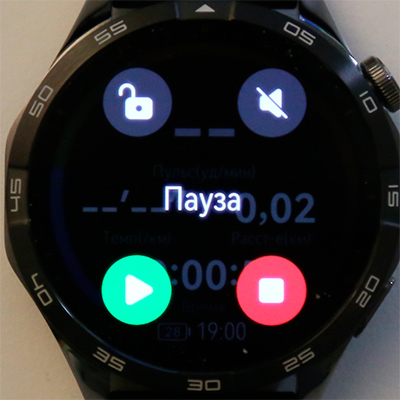 Из режима тренировки можно переключиться на циферблат (то есть многозадачность поддерживается), но это делается кривовато: надо 2 раза нажать верхнюю кнопку, тогда появляется интерфейс смены циферблата, где можно переключиться с тренировки на циферблат. И на циферблате сверху будет значок о том, что идет тренировка, нажав на который можно вернуться в тренировку. В самой тренировке доступен аудиоплеер и окно управления тренировкой.