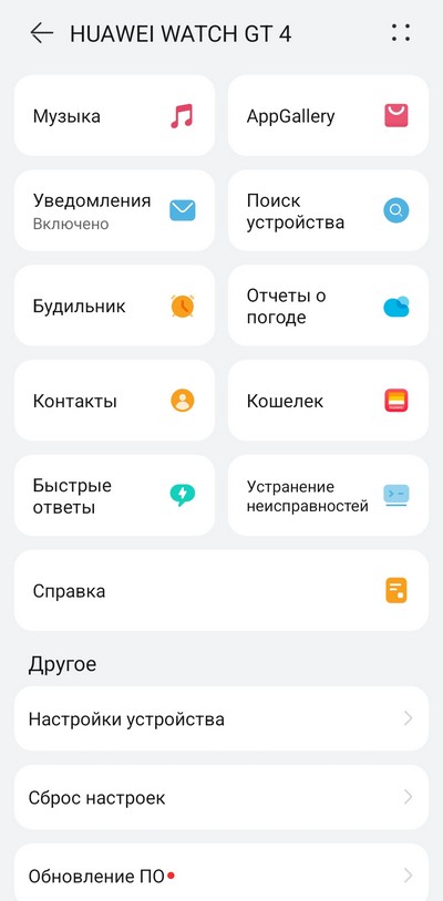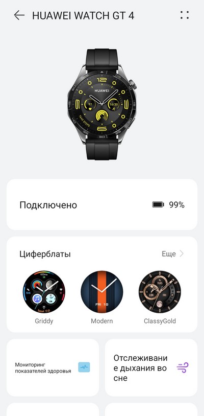 Подключенные к приложению часы. Обратите внимание на то, что среди избранных приложений есть "Кошелек HUAWEI". Сервис Huawei Pay в настоящий момент доступен в Китае, России, Гонконге, Пакистане, Сингапуре, Макао и Таиланде. Европа и Штаты при этом в пролете - платить этими часами там не получится.