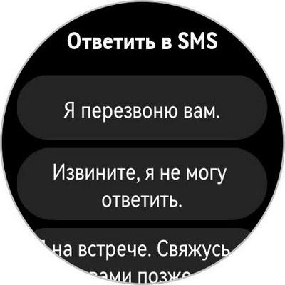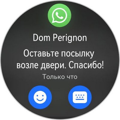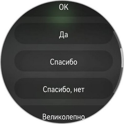 От циферблата свайп вниз - уведомления, пришедшие со смартфона. Их можно просматривать списком, открывать каждое уведомление, чтобы его прочитать целиком. На уведомление можно ответить смайликом, текстом на разных языках, предустановленным сообщением.