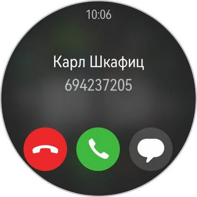 Входящий звонок. Его можно отклонить, принять на часах, ответить через SMS. Исходящие звонки с часов тоже можно делать (при наличии подключения к смартфону, конечно): приложение "Контакты" может синхронизировать данные с контактами смартфона через приложение Huawei Health.