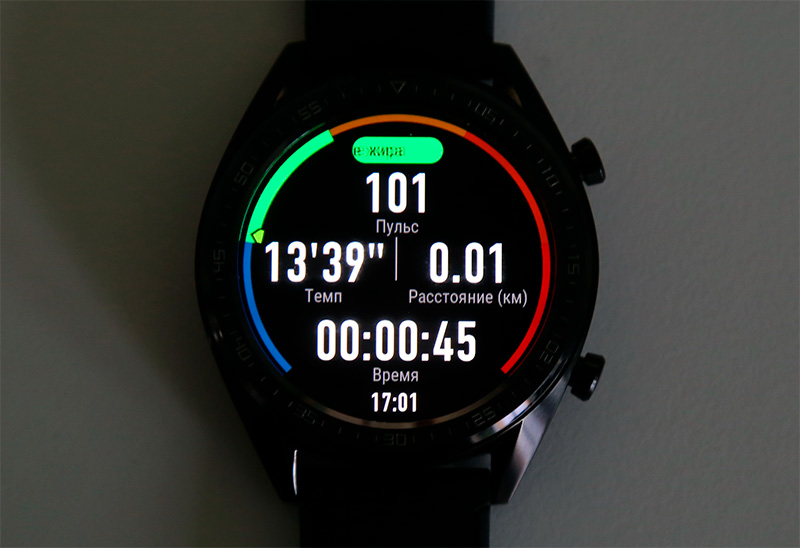 При тренировке цветовыми линиями по окружности показывается уровень активности: разминка, сжигание жира, полная загрузка.