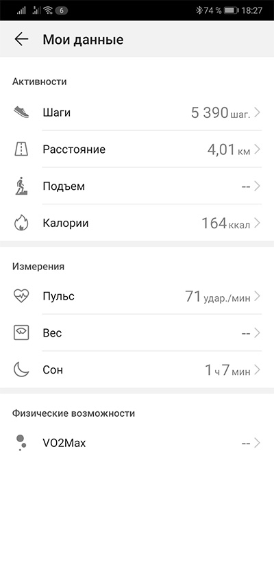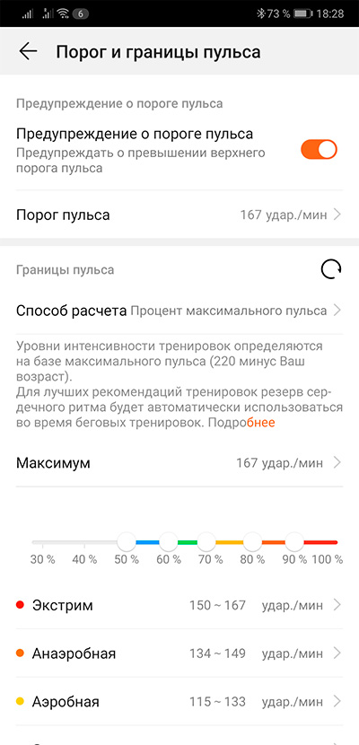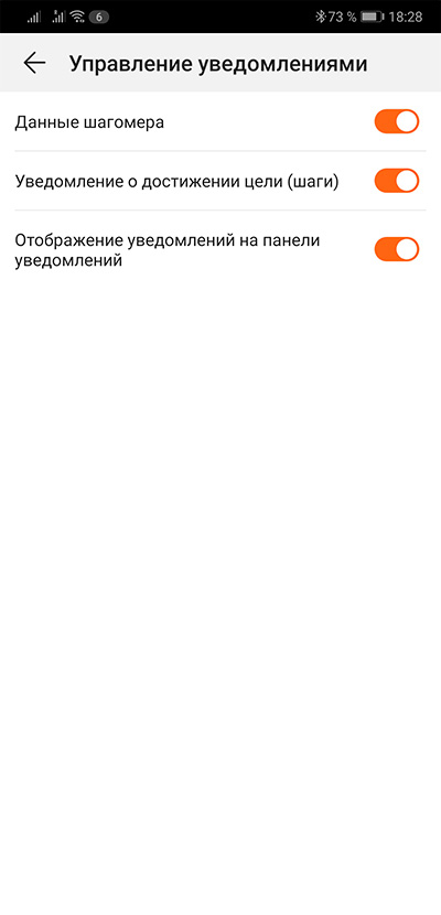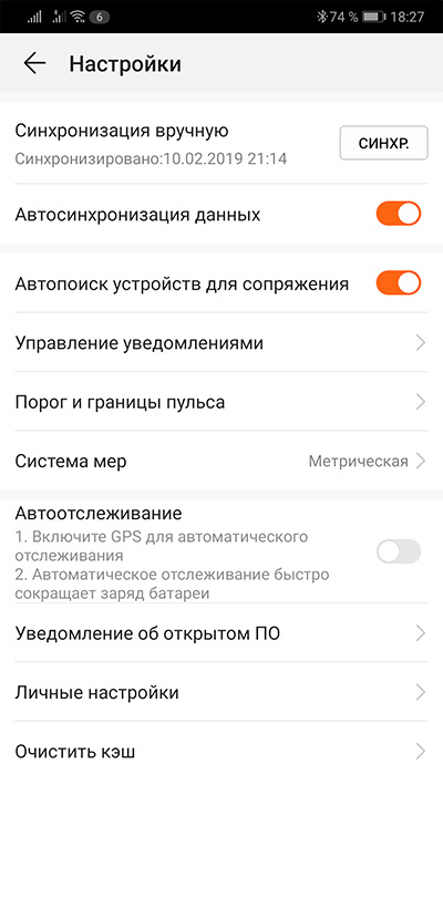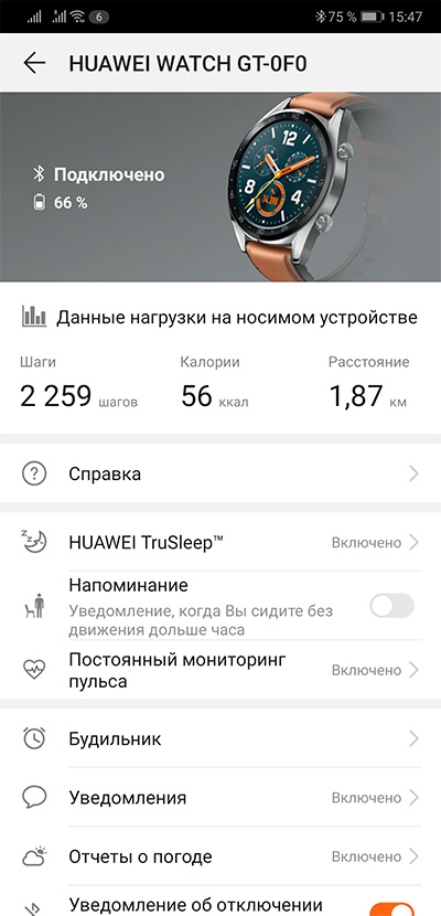 Также здесь включаются-выключаются отслеживание сна HUAWEI TruSleep, мониторинг пульса, напоминания об активности, уведомления об отключении Bluetooth (полезная штука, чтобы не забыть смартфон при уходе из дома) и автообновление прошивки.