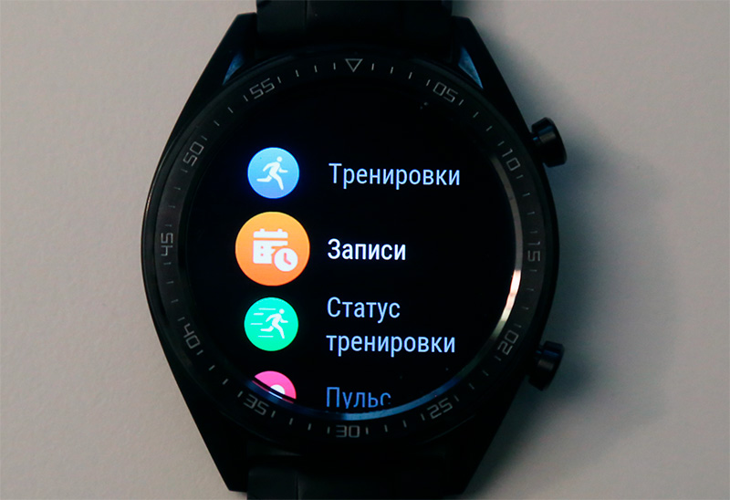 Нажатие верхней кнопки - данные и приложения. Тренировка, записи тренировки, статус тренировки, пульс, активность, сон, барометр, компас, погода, сообщения, таймер, будильник, фонарик, поиск телефона и настройки.