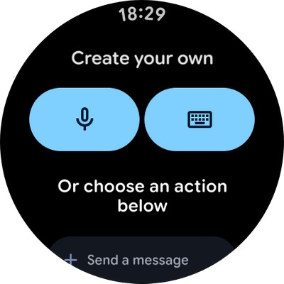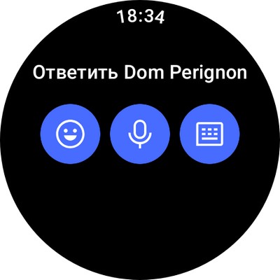 Свайп от циферблата вверх - сообщения. Они идут списком, по конкретному сообщению мощно щелкнуть - оно откроется целиком. На сообщение можно отвечать смайликами, голосом (система будет распознавать сказанное и отправит в виде текста) или просто вызвать экранную клавиатуру, чтобы что-то написать. Возможности ответить стандартной фразой из списка здесь нет.