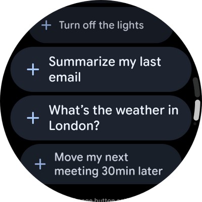 Это Gemini и примеры команд, которые этот ассистент может выполнять. (Русский язык интерфейса здесь поддерживается, но я выставил английский, потому что так тексты будут заметно компактнее, что актуально для такого маленького экрана.