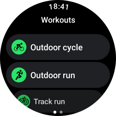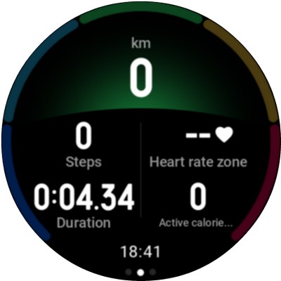 Отслеживание спорта идет в параллельном режиме, в любой момент можно нажать верхнюю кнопку, чтобы вернуться к циферблату и там дальше можно вызывать любые приложения, а на отслеживание спорта будет указывать значок в самом низу циферблата. На него можно нажать, чтобы вернуться к отслеживанию спортивной активности.