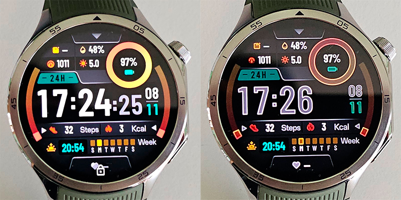 Вот, например, слева циферблат в активном режиме, справа - "спящий" режим.