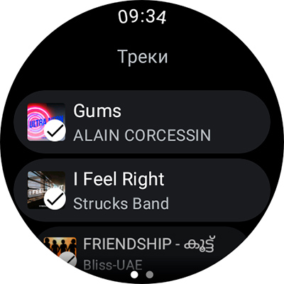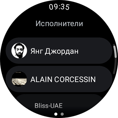 В аудиоплеере недоступно воспроизведение треков с часов, только со смартфона. Однако в приложении YouTubeMusic можно скачивать какие-то композиции на часы по WiFi и воспроизводить их через подключенные по Bluetooth наушники. Скачанные треки можно выводить списком, а можно группировать по исполнителям.