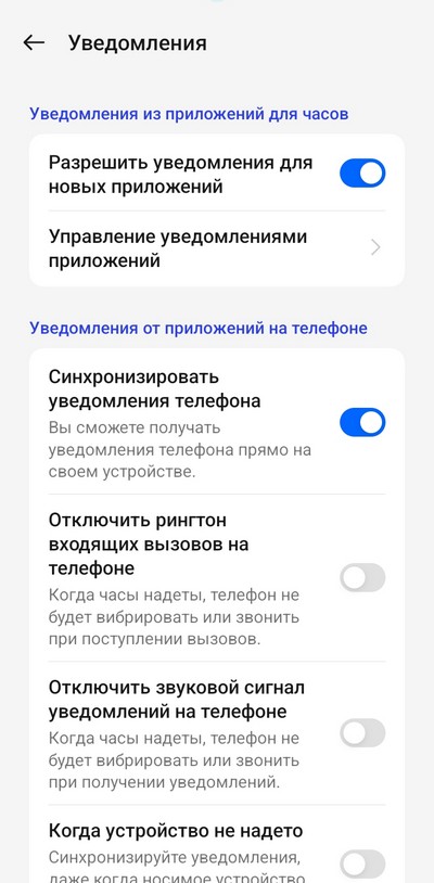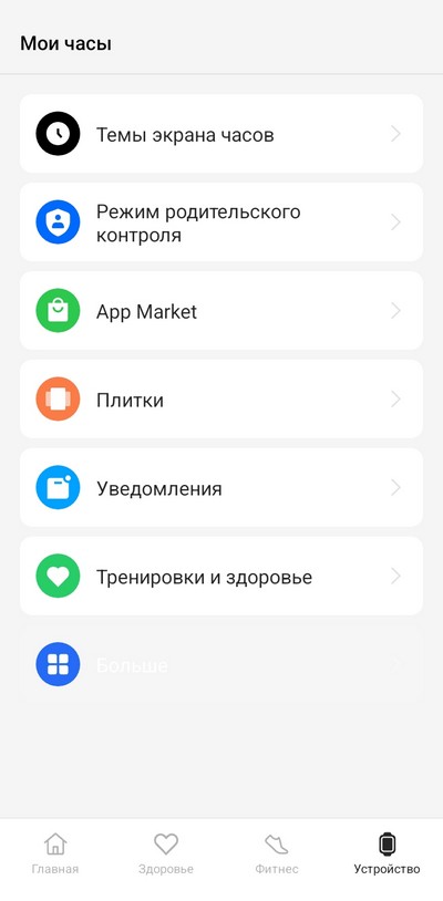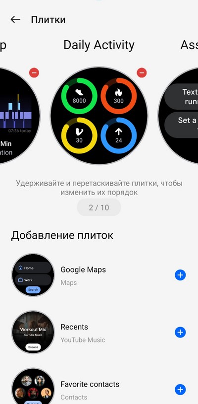 Настройка плиток (то есть виджетов, которые появляются при скроллинге вправо-влево на часах) и настройка уведомлений. Замечу, что в качества виджетов можно использовать очень ограниченный набор приложений. У часов Samsung для виджетов можно использовать любые приложения.