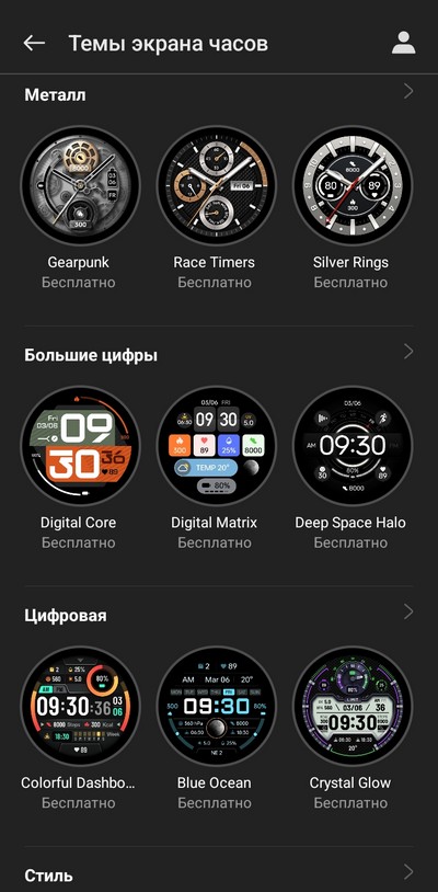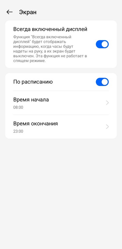Здесь есть полноценный режим AOD (для него можно задавать расписание), и каждый циферблат имеет свой "спящий" режим. Есть циферблаты, у которых "спящий" режим выглядит очень эффектно и ярко - не хуже, чем у часов Samsung.
