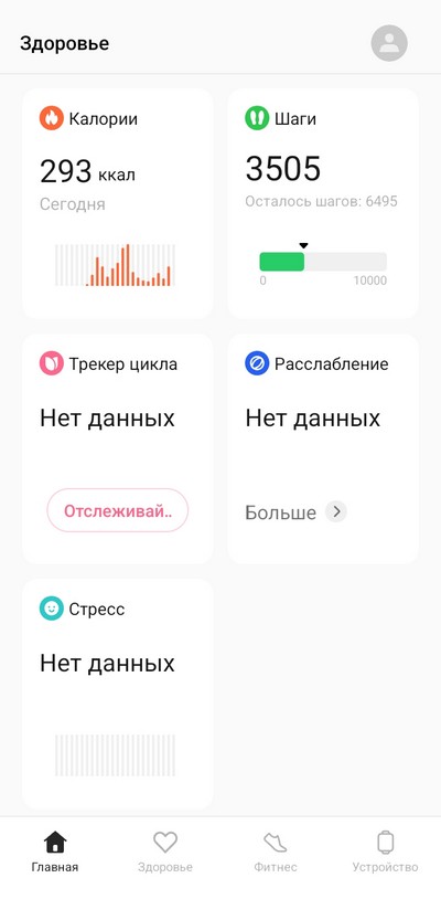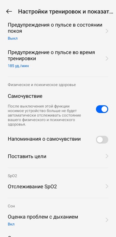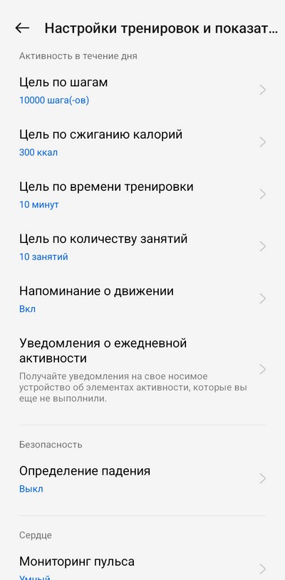 Настройки тренировок и показателей здоровья.