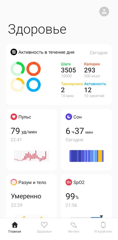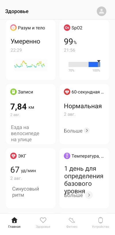 Здесь есть как стандартные функции мониторинга - пульс, оксигенация крови, частота дыхания, температура кожи, уровень стресса, ЭКГ (доступно не во всех регионах) - так и комплексные, к которым относится средний показатель самочувствия, а также 60-секундная проверка здоровья, для запуска которой надо прикоснуться пальцем к верхней кнопке, и там в течение минуты отслеживается несколько различных параметров, к которым также относится "возраст сосудов" и здоровье сердца (комплексный показатель эластичности сосудов, пульс и ЭКГ).