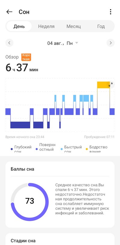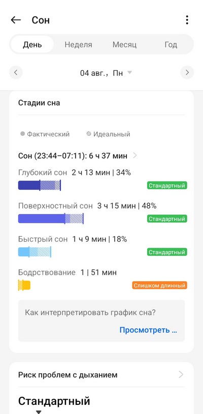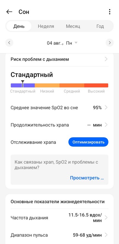 Сон отслеживается очень подробно, часы умеют измерять храп (с помощью смартфона, который должен лежать недалеко), и по поводу сна дают подробный отчет с рекомендациями. По качеству отслеживания сна эти часы превосходят часы Samsung, у которых известная проблема - они часто не ловят ситуацию, когда я просыпаюсь на какое-то время, а потом снова засыпаю. У данных часов этой проблемы нет, все отслеживают четко. Также отслеживают дневной сон и его записывают отдельно.