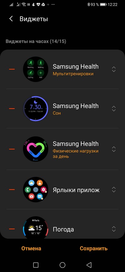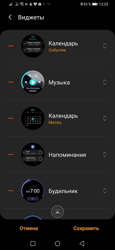 Виджеты, подчеркиваю, редактируются как в часах, так и на смартфоне. Убираете ненужные, устанавливаете нужные.