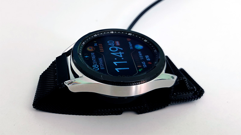 Серебристый металлический корпус, поворотное кольцо безеля. У Gear S3 у меня краска на безеле облупилась через год использования, так что часы совершенно потеряли представительный вид. Впрочем, мы это обсуждали в блоге: многие пользователи этих часов написали, что у них ничего подобного не произошло и за два-три года использования.