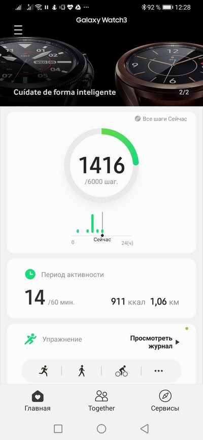 Главное окно Samsung Health, часы подключены.