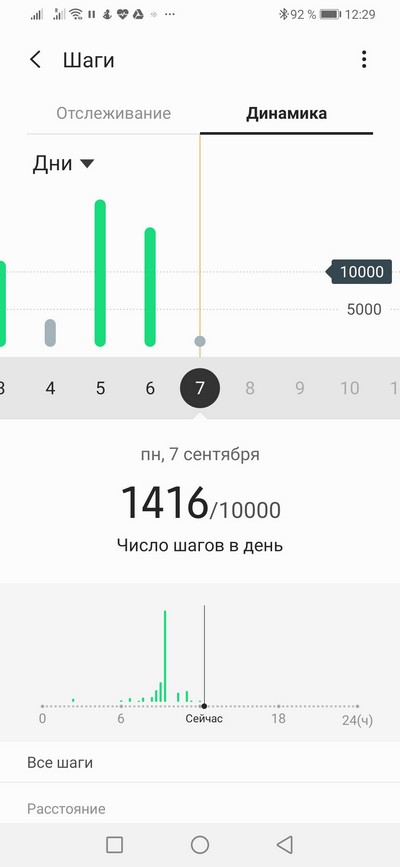 Скриншот ниже - 12:29, сделано 1416 шагов, цель 10000 шагов.