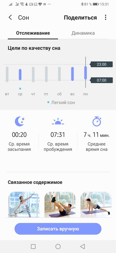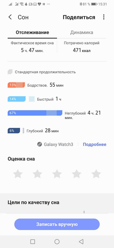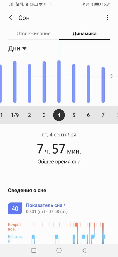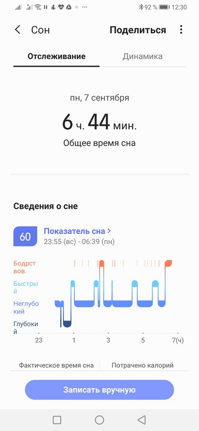 Данные о сне с подробной историей и динамика сна.