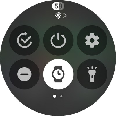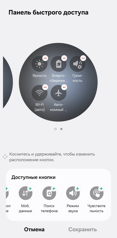 Свайп от циферблата вниз - - панель быстрого доступа: выбор режима (сон, театр), выключение, настройки, отключение любых уведомлений, режим AOD , отключение звука/вибрации, фонарик, яркость экрана, включение энергосбережения, громкость, Wi-Fi, самолетный режим, подключение наушников, поиск смартфона и так далее. Быстрые переключатели - их количество и порядок следования - можно настраивать.