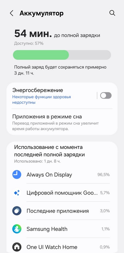 В самом активном режиме использования - отслеживание пульса раз в 10 минут в обычном режиме (на тренировке, разумеется, отслеживание идет уже в непрерывном режиме), расширенное отслеживание сна, стресса, уровня оксигенации, определение тренировки, режим AOD, подключение к Wi-Fi, оплата часами, использование всяких приложений, вроде калькулятора, календаря, работа с приложениями, отслеживание часовой тренировки - часы жили два дня. Обычно после первых суток работы часы показывали где-то 60-65% заряда, у Watch7 было менее 50%.
