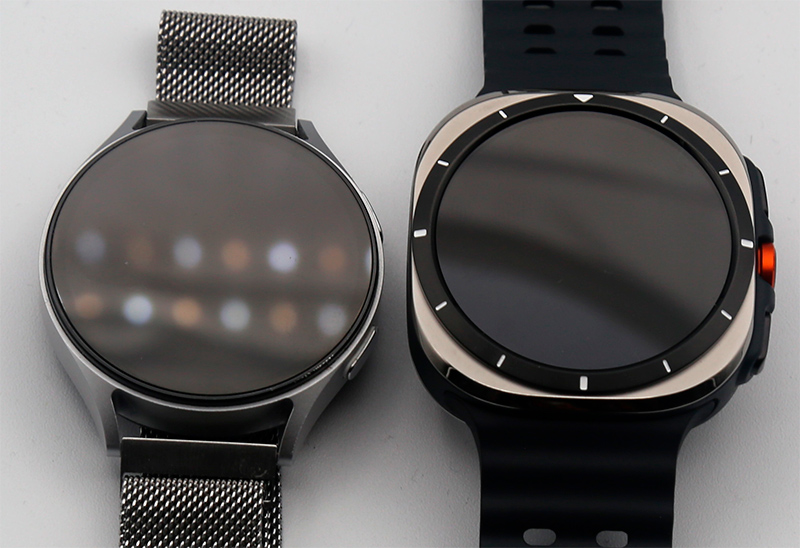 Вот эти часы рядом со стандартными Samsung Galaxy Watch7. Экраны у них совершенно одинаковые, модель Ultra немного больше только за счет выступающих скошенных углов.