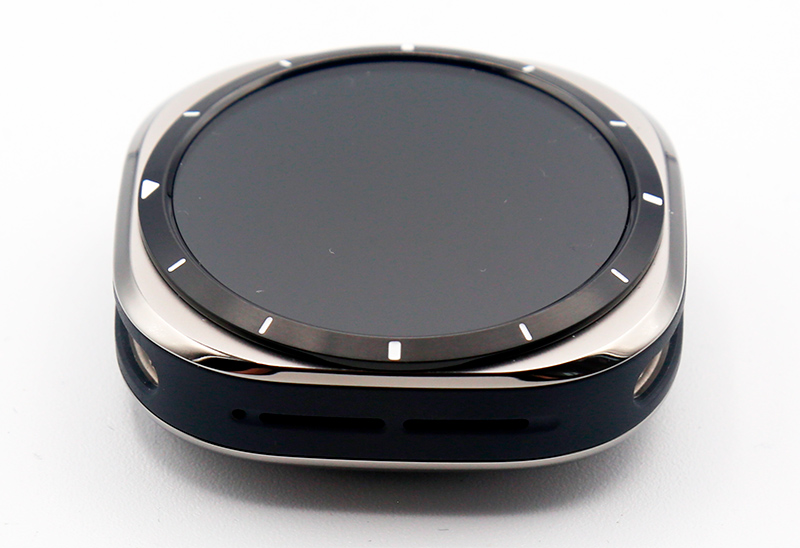 Массивный корпус из титанового сплава, круглый дисплей вписан в квадрат со скошенными краями. На неподвижный безель нанесены деления.