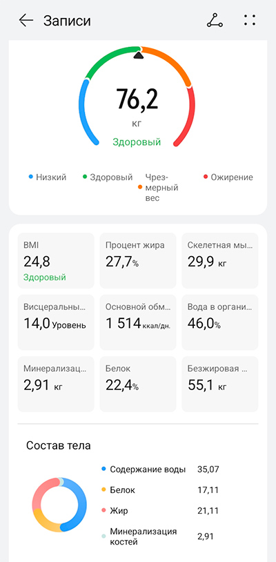 - Рассказывают подробности про каждый из параметров измерений (не весы, а приложение Huawei Health). И ещё какие-то рекомендации, но довольно нехитрые конечно. Всё на бесплатном аккаунте. Предлагают ещё подписку на какой-то сервис который будет ещё персональные планы строить и.т.д. Но мне это и не нужно.